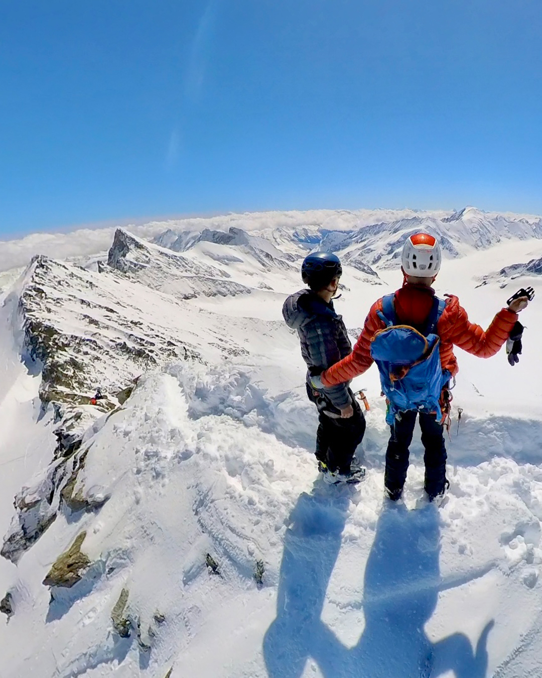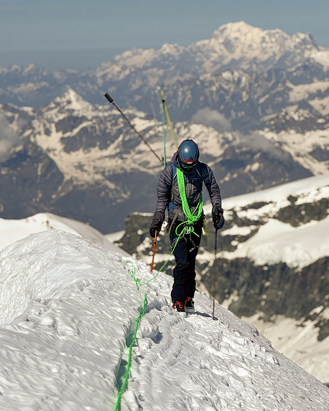 Einer der markantesten Momente des bisherigen Projekts war die Besteigung des Matterhorns (4.478 m) über den Liongrat, eine der anspruchsvollen klassischen Routen auf diesen ikonischen Gipfel. Der Grat ist ausgesetzt, technisch fordernd und verlangt über lange Zeit absolute Konzentration. Der Aufstieg bis zur Carrelhütte war schön, teils technisch und anstrengend aber gut vorbereitet und geplant. Am Abend gegen 19 Uhr, kurz vor dem Schlafengehen änderte sich die Situation abrupt: Zwei italienische Bergsteiger war am Ende seiner Kräfte, einer hatte sich im Schneesturm schlafen gelegt, der andere hatte es gerade noch zur Hütte geschafft. Was folgte, war kein Heldentum, sondern routiniertes Handeln. Ein französisches Paar, Tim und Tobias sicherten den Verunglückten, leisteten Erste Hilfe und organisierten die Rettung per Flaschenzug bis zur Hütte. Der Gipfel rückte in diesem Moment in den Hintergrund. Am Berg zählt nicht der Rekord, sondern der Mensch. Der Italiener überlebte mit schweren Erfrierungen. Wenige Stunden später, nach einer jetzt noch kürzeren Nacht, erreichten sie den Gipfel. Für Tim war es ein prägender Moment: der Berg als Ort der Grenzerfahrung – aber auch der Verantwortung.